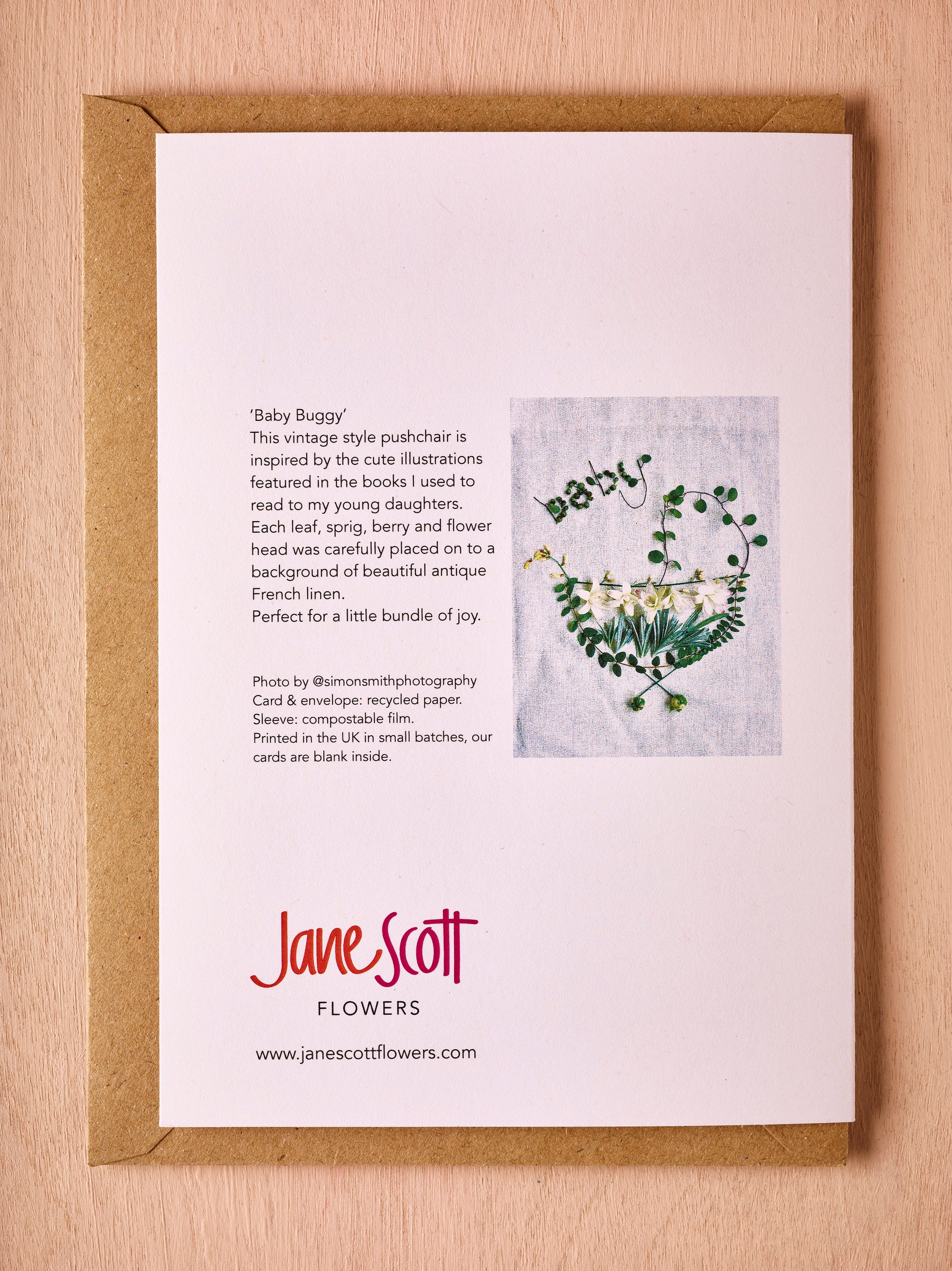 Our cards are lovingly designed, styled and photographed in London. They are printed in small batches in the UK on luxurious 350gsm recycled card. The envelopes are made from recycled kraft paper and our clear sleeves are fully compostable.
