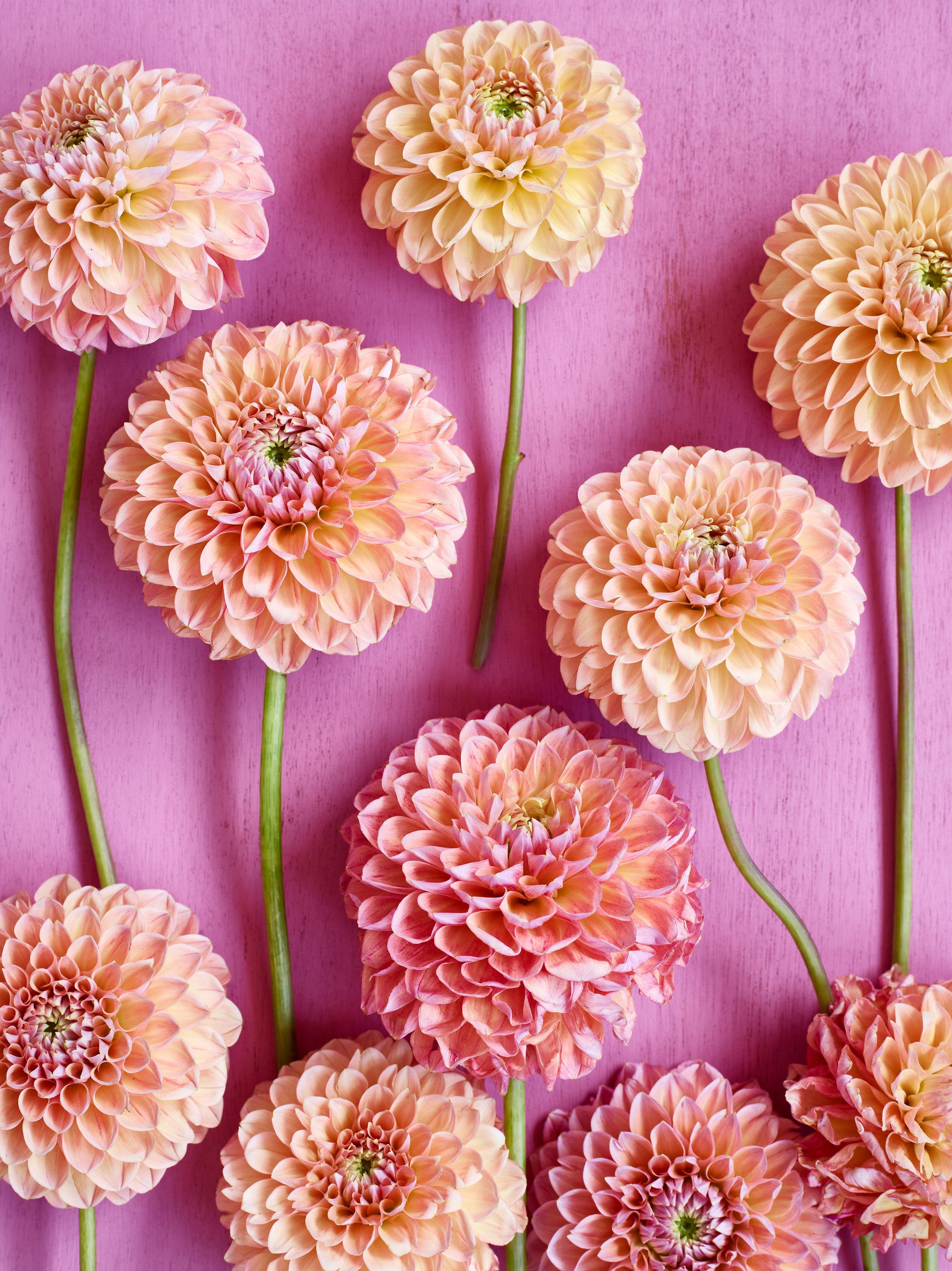 'Pompoms of perfectly curled petals in the prettiest shades of pale peach and dusty Rose. They glow when bunched with other Dahlias and look beautiful in Autumnal hand tied bouquets. We especially love them mixed with the dark leaves of NInebark and the fluttery seedheads of Honesty.'